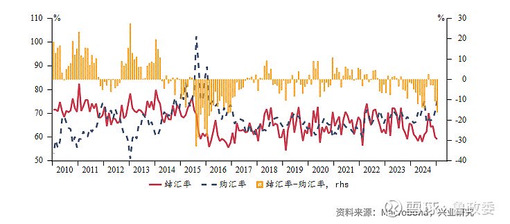 2025年1月结汇率为59.1%,较2024年12月着落0.5%;购汇率为75.3%,较2024年12月高涨4.6%。购汇率较结汇率差额扩大至16.2%,为2016年11月以来最大差额。