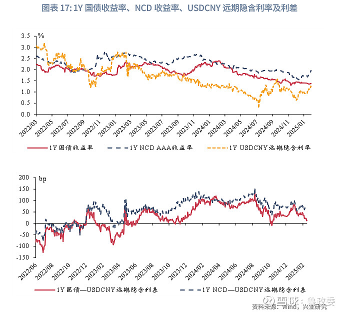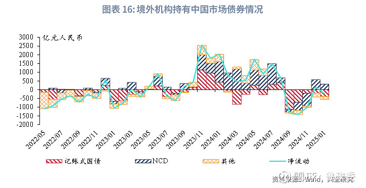 2025年11月,境外投资者执有的中国债券界限减少232亿元东说念主民币。其中记账式国债托管界限减少了388亿元东说念主民币,为外资蚁集第5个月减执利率品;同行存单加多了315亿元东说念主民币。一方面,国债和NCD较USDCNY远期隐含利率之间的利差再行缩窄;另一方面,多数短期国债和NCD在近期连续到期,2024年第三季度以来的净流动走势与2023年第三季度以来的净流动走势呈镜像相干。在二者共同影响下,2025年上半年外资总执有的中债界限或将执续面对压力。