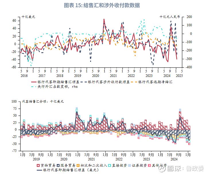 2025年1月,银行代客结售汇录得逆差392亿好意思元,前值为逆差105亿好意思元,环比逆差扩大287亿好意思元;银行远期代客净结汇逆差47亿好意思元,前值逆差20亿好意思元,环比逆差扩大27亿好意思元;银行代客涉外收付款逆差265亿好意思元,前值顺差558亿好意思元,环比逆差扩大823亿好意思元。