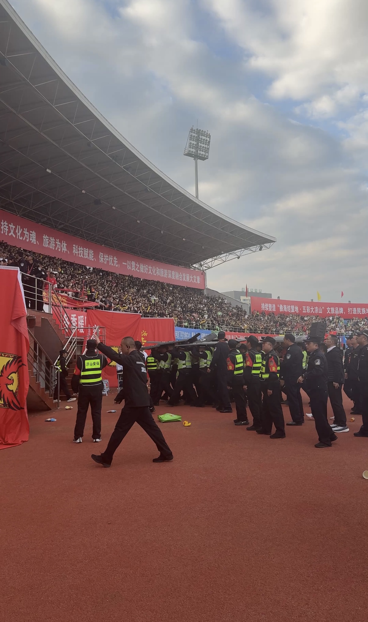 据现场视频,比赛闭幕后,当值裁判团队走向看台标的准备退场。走到塑胶跑说念中间时,凉山队别称球员片刻冲向裁判,体魄跃起并向裁判挥拳,裁判回身逃匿,队友和现场安保将两东说念主分开。之后,安保东说念主员将护盾举及其顶,护送裁判一转退场。