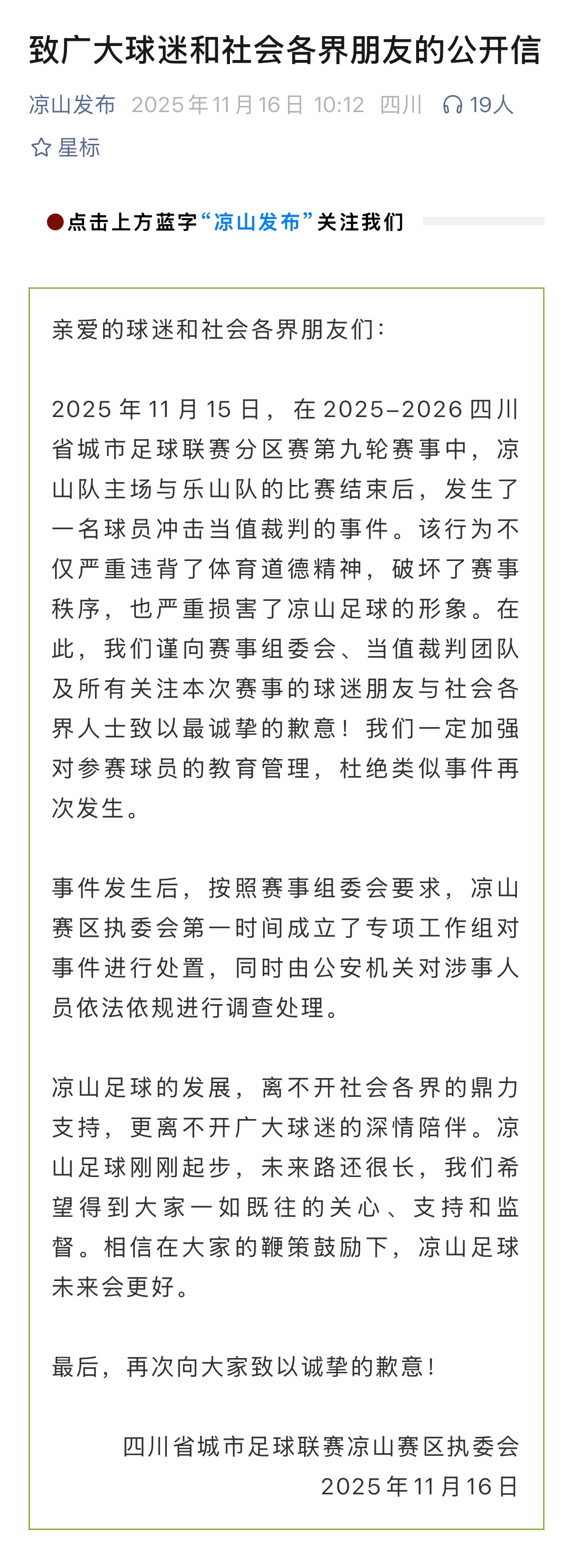 信中写说念:凉山队主场与乐山队的比赛闭幕后,发生了别称球员冲击当值裁判的事件。该行径不仅严重抵挡了体育说念德精神,龙套了赛事次第,也严重毁伤了凉山足球的形象。在此,咱们谨向赛事组委会、当值裁判团队及所谈论注本次赛事的球迷一又友与社会各界东说念主士致以最诚笃的歉意!咱们一定加强对参赛球员的老师不绝,阻绝雷共事件再次发生。